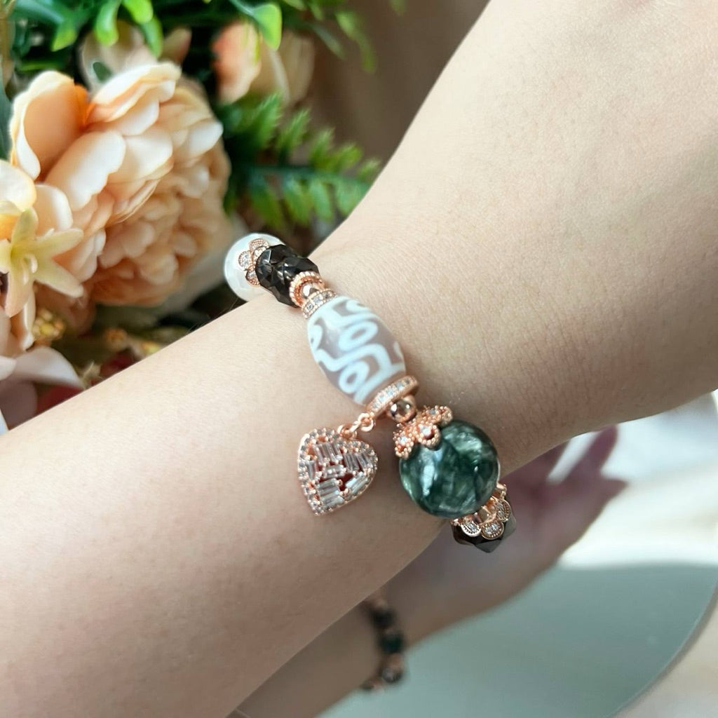 9-Eye Dzi, Seraphinite, Smoky Quartz, Green Gemmy Lepidolite, Bronzite, Mother of Pearl