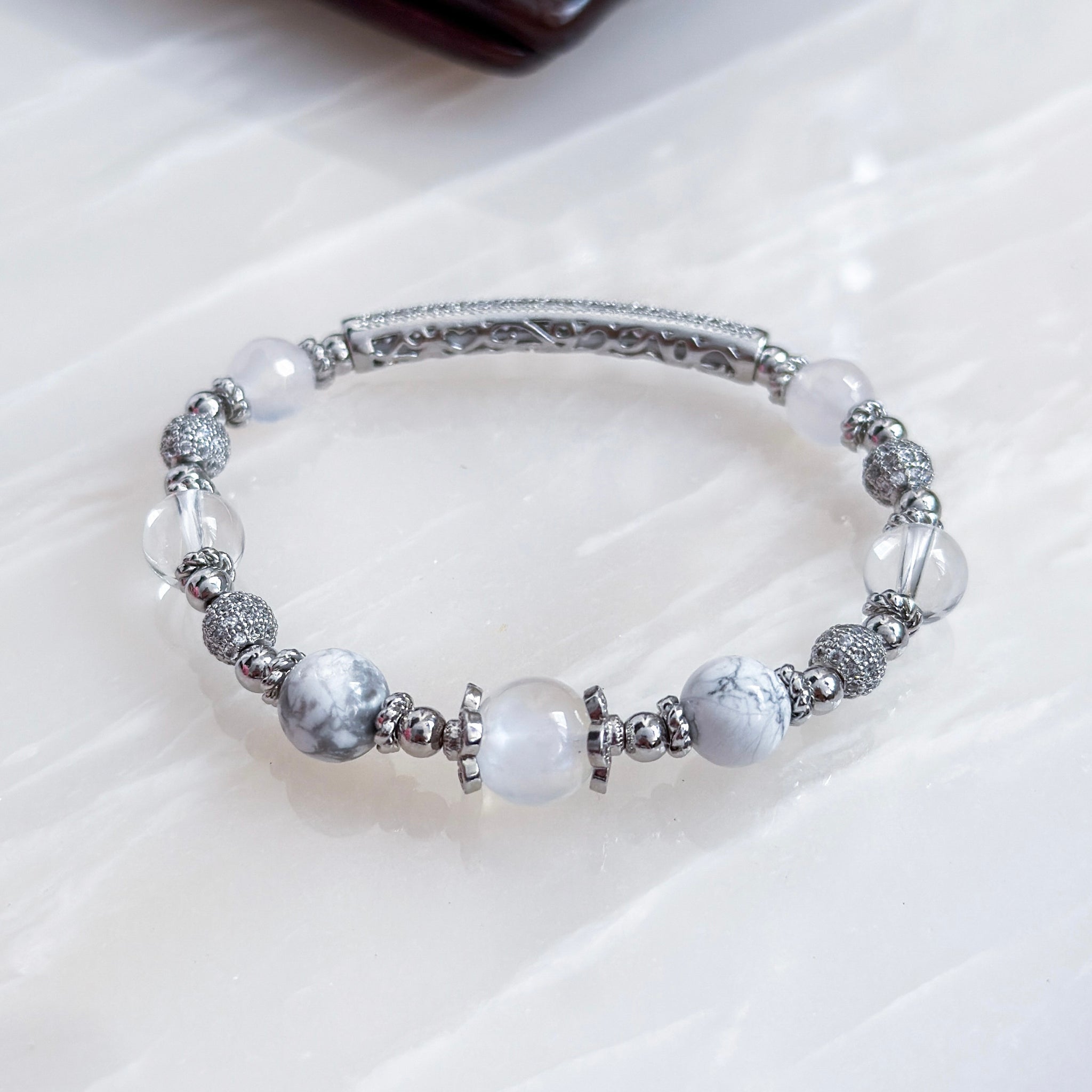 • Howlite – Calms the mind, eases tension and reduces stress or overthinking. • Clear Quartz – Amplifies clarity, intention, and energetic balance.